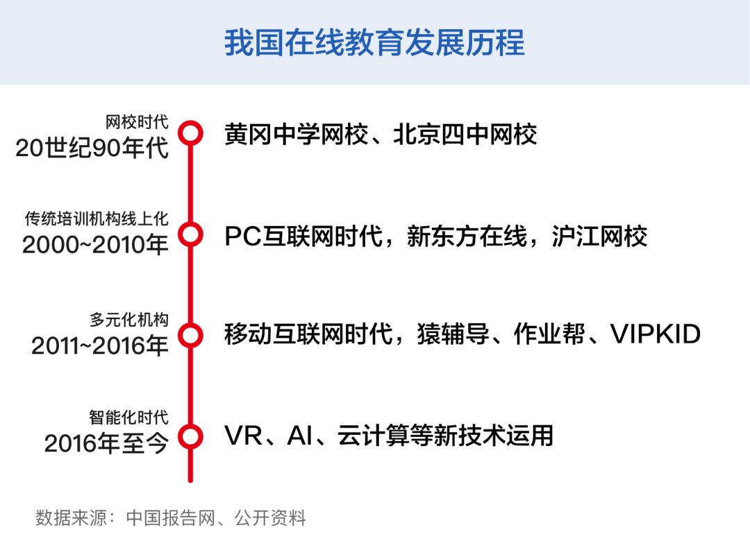 在線教育并不是什么新鮮事。20世紀90年代末,互聯(lián)網進入中國。當時黃岡中學、北京四中等名校開辦的網絡學校拉開了中國網絡教育的序幕,“互聯(lián)網+教育”模式得到認可。