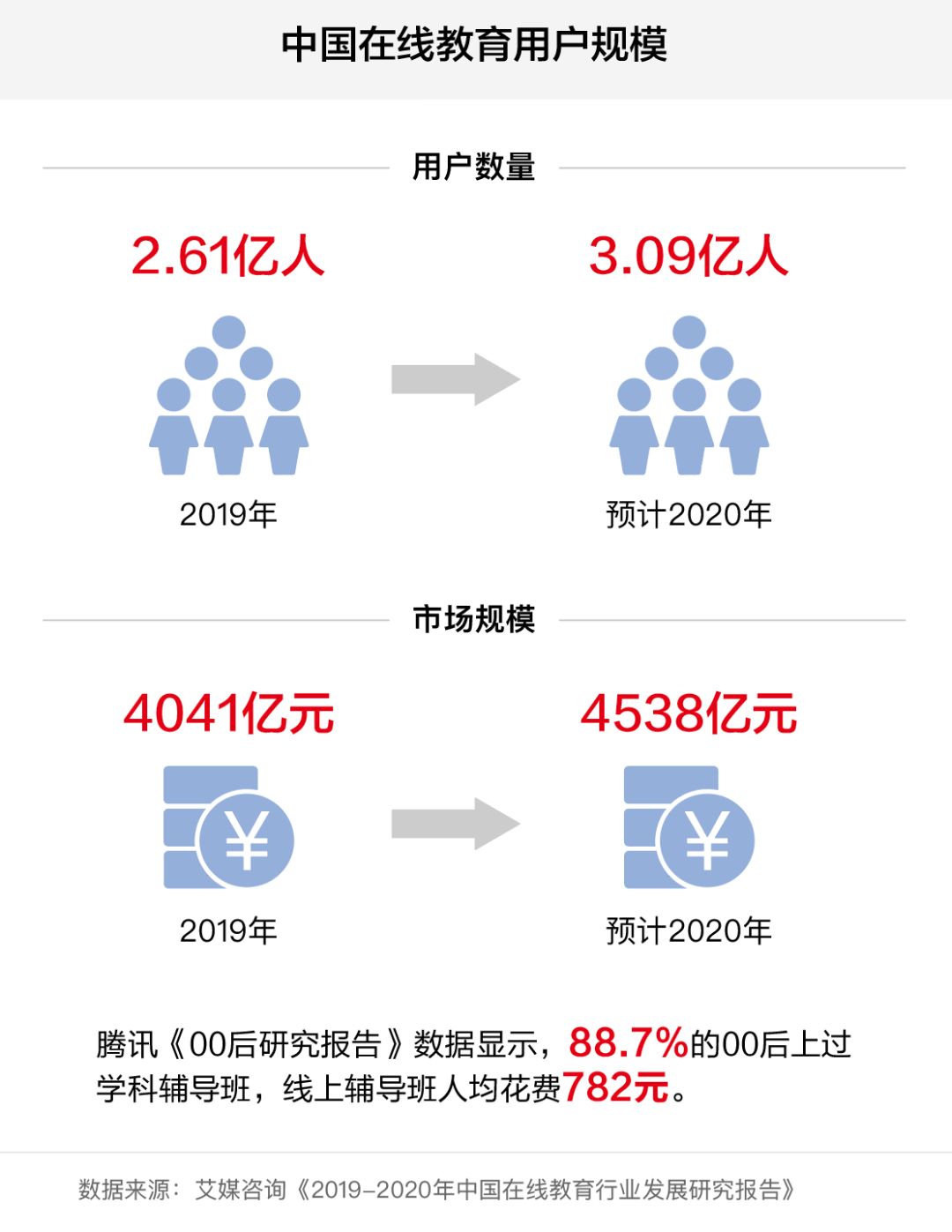 據艾傳媒咨詢《2019-2020中國在線教育產業(yè)發(fā)展研究報告》顯示,2019年中國在線教育用戶規(guī)模達到2.61億,市場規(guī)模達到4041億元。預計2020年中國在線教育用戶規(guī)模將達到3.09億。市場規(guī)模將達到4538億元,同比增長15.5%;騰訊《00后研究報告》顯示,88.7%的00后學生參加過學科輔導班,在線輔導班平均費用為782元。