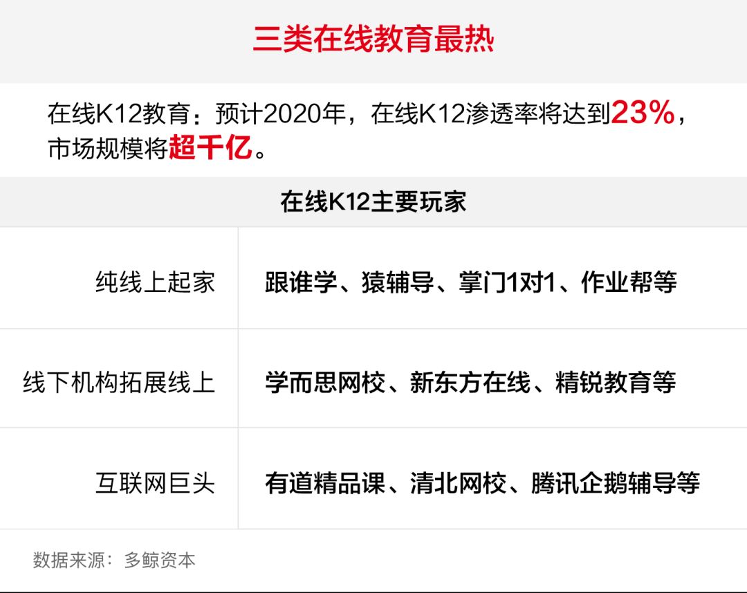 隨著升學競爭的長期存在,K12課外輔導已經成為不可動搖的需要。多鯨資本數據顯示,截至2018年,國內K12學生人數超過1.74億,相應的K12課外輔導市場超過4000億元。傳統(tǒng)教育機構、互聯(lián)網巨頭、互聯(lián)網團隊等不同背景的創(chuàng)業(yè)者紛紛涌入,以英語、數學為主。其中優(yōu)質項目吸金能力強,紅杉中國、GGV、IDG等一線資本均完成布局。過去一年,在線k12企業(yè)融資金額最高的是“一對一”E輪融資,融資金額3.5億美元;其次是“小盒子科技”1.5億美元的D輪融資。