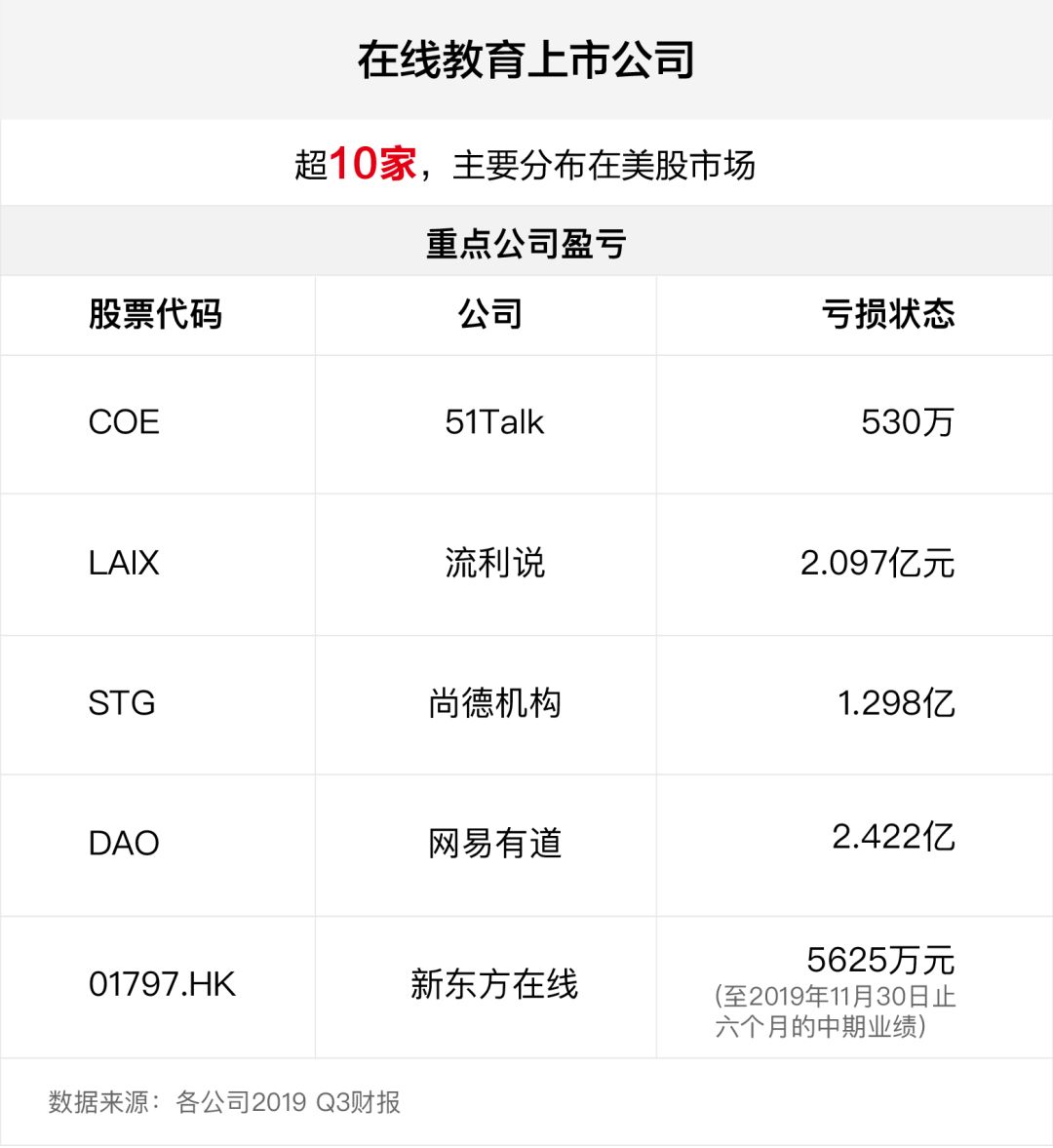 記者注意到,目前成功上市的網絡教育公司有10多家,大部分集中在美國股市。根據已公布的2019年第三季度財報顯示,流利談話、51Talk、尚德、新東方在線等知名公司均出現(xiàn)不同程度的虧損。